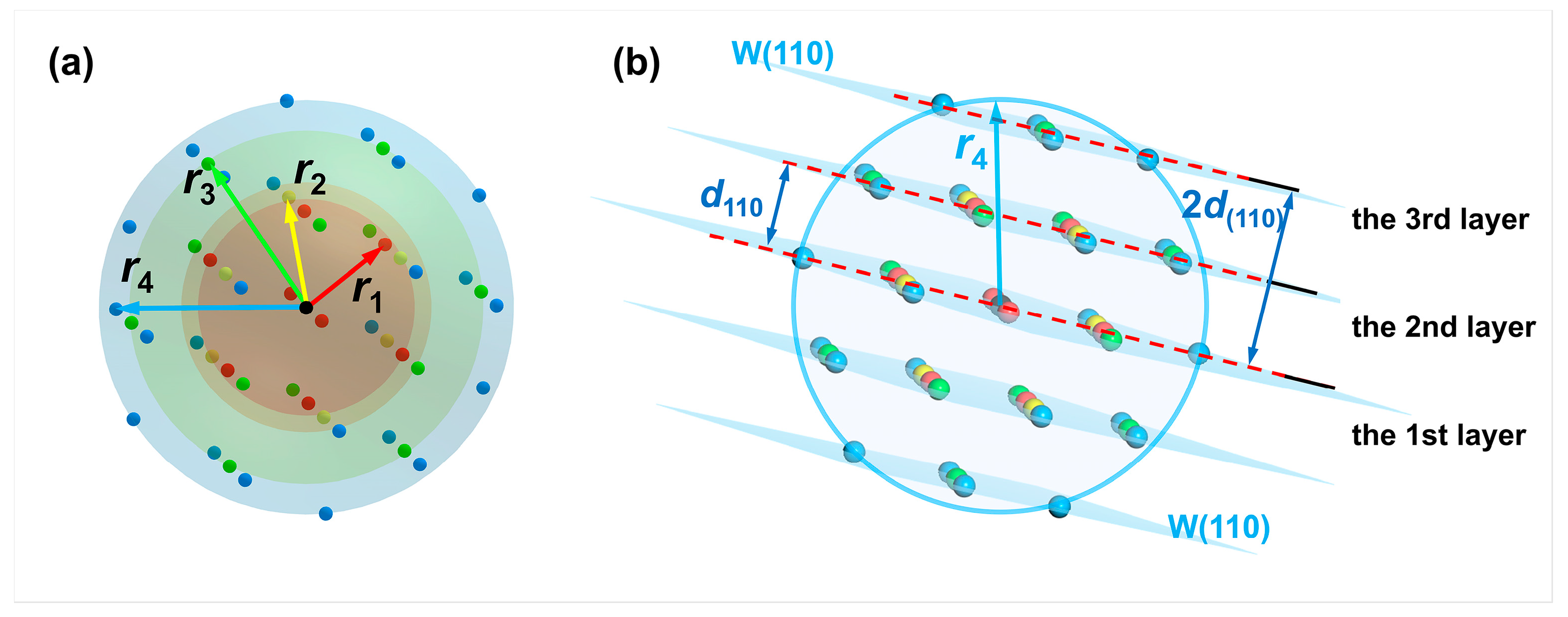 The reference atom can be arbitrary in the bulk phase. The first to fourth nearest neighbor atoms (colored in red, yellow, green, and blue) of the reference atom (colored in black) in the perfect crystal arrangement of W are illustrated in Figure 4a. In the meantime, the W(110) crystal plane where the reference atom is located can be set as the first W(110) layer. Since the interplanar spacing of the W(110) crystal plane is d 110 = 2.2380 Å, there is also a distribution of atoms in parallel planes at distances from the first W(110) layer that are integer multiples of d 110 , such as 2 d 110 , 3 d 110 , and so on. The parallel plane at a distance d 110 = 2.2380 Å from the first layer is set to the second W(110) layer for research purposes. Similarly, the third layer is set at a distance 2 d 110 = 4.4760 Å from the first W(110) layer, as illustrated in Figure 4b.