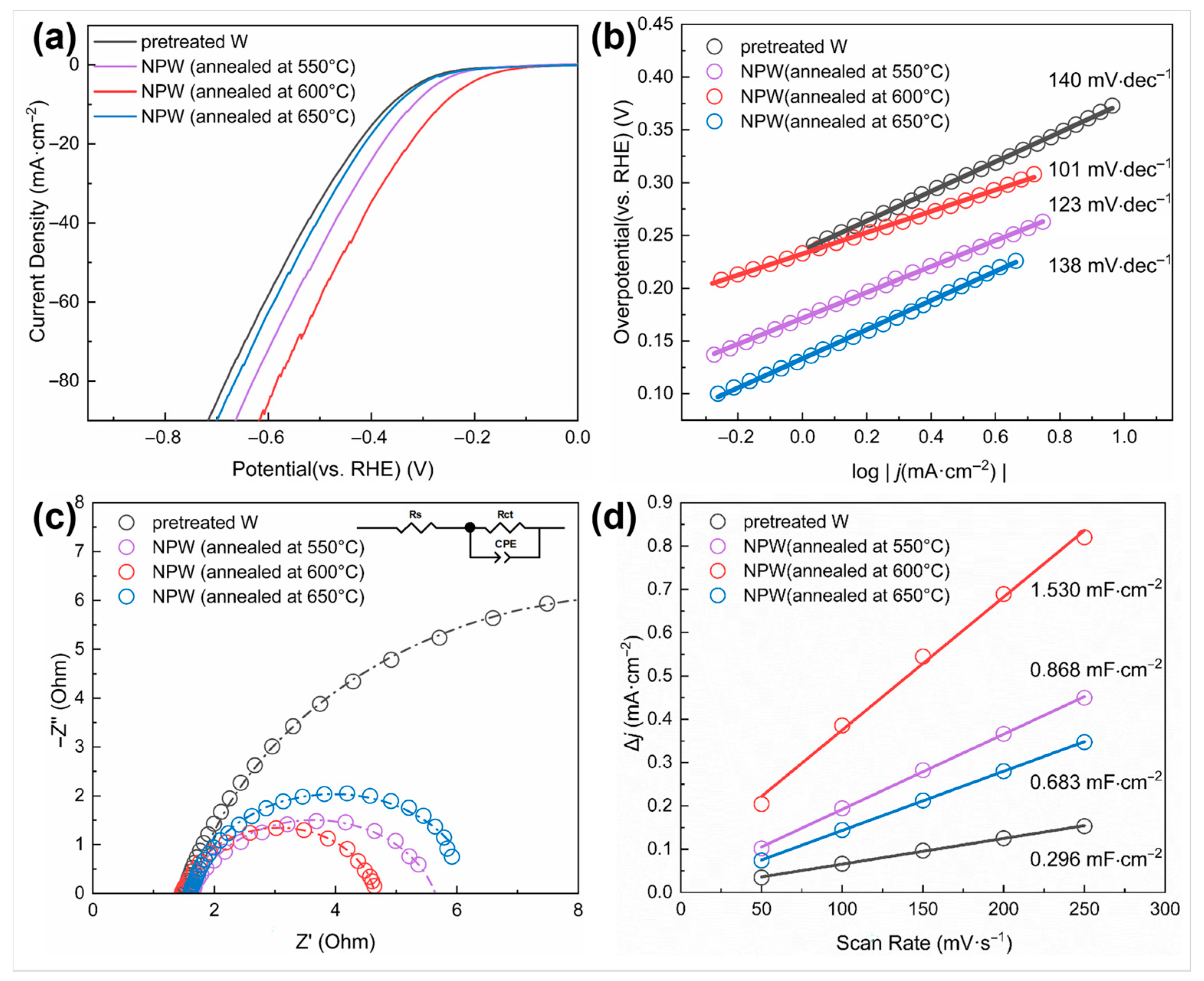 The effect of nano-treatment on surface activity was measured by electrochemical tests and comparison between the pretreated W samples, which were ground and polished only, and those NPW foils annealed at different temperatures. Figure 7a shows the linear sweep voltammetry (LSV) curves of the W samples. It can be seen that the NPW (annealed at 600 °C) exhibited the lowest overpotential ( η 10 = 262 mV) when the current density reached 10 mA/cm2, which was lower than W without nano-treatment (362 mV), and NPW deoxidized at 550 °C (318 mV) and 650 °C (352 mV). Moreover, the η 1 of nano-treated W (annealed at 600 °C) was 124 mV, lower than that of W without nano-treatment (211 mV), indicating higher surface activity. According to the Tafel plot converted from the LSV polarization curves (Figure 7b), the Tafel slope of NPW annealed at 600 °C (101 mV/dec) was much lower than that of W without nano-treatment (140 mV/dec), indicating that nano-treated W exhibited superior reaction kinetics of HER. In addition, the Nyquist plot represents the impedance information at −0.56 V versus (vs.) SCE, i.e., −0.3 V vs. RHE, as shown in Figure 7c, from the electrochemical impedance spectroscopy (EIS) technique employed. Compared to W without nano-treatment, NPW annealed at 600 °C had a smaller-diameter semicircle in the low-frequency range of the Nyquist plot, which means that it had a smaller value of R ct (3.162 Ohm compared to 15.04 Ohm), a faster rate of HER charge transfer, and better electrochemical performance. Moreover, A linear fit is applied and demonstrated in Figure 7d, with capacitive current densities as the dependent variable and scan rates of cyclic voltammetry (CV) tests as the independent variable (varying from 50 to 250 mV/s in this work). The obtained slope value would correspond to C dl . It can be seen from Figure 7d that the estimated C dl value of NPW (600 °C annealed) is much higher than that of W without nano-treatment, indicating that nano-treatment led to a larger effective electrochemical active surface area since the electrochemical active surface area (ECSA) could be considered proportional to the double-layer capacitance ( C dl ) [25]. Since the nanoporous tungsten produced in this study is intended for use as a disposable composite interconnect material, rather than as an electrocatalytic or battery material, long-term stability tests on the tungsten samples were not conducted.