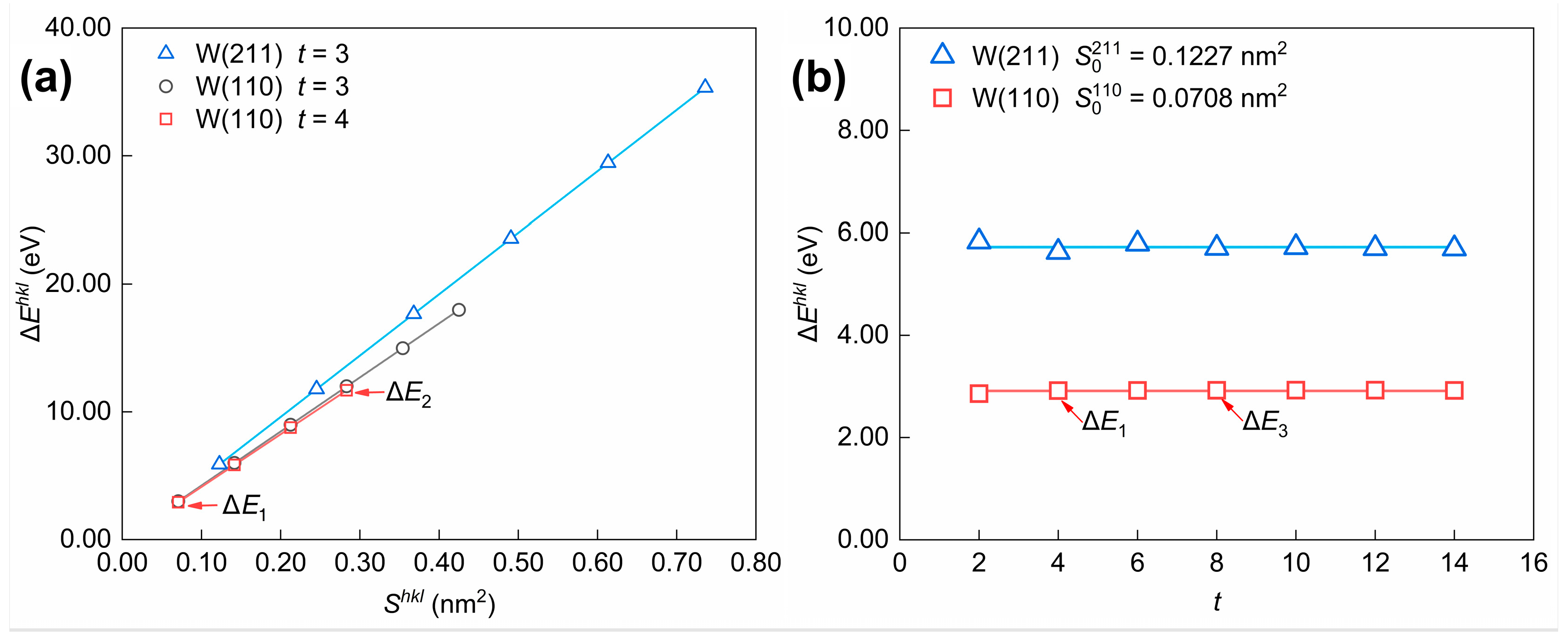 Figure 11. Influence of selected parameters (a) S h k l and (b) t for model construction on the energy difference ( Δ E h k l ). The calculation results are derived from the surface slab model for W(110) and W(211) crystal planes. The Δ E k values of Model 1 to Model 3 in Figure 10 are denoted as Δ E 1 , Δ E 2 , and Δ E 3 .