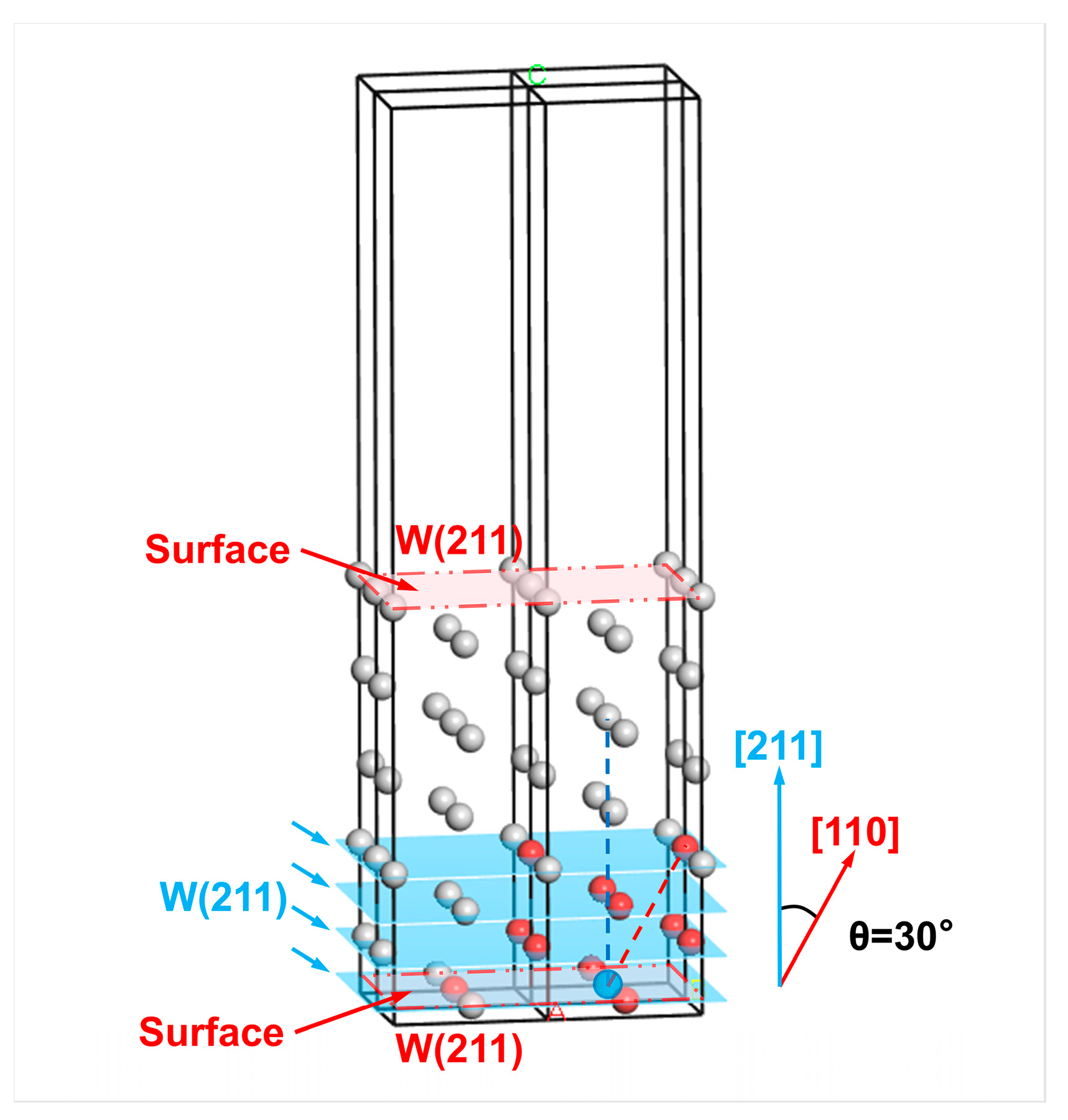 Figure 13. Selection of the surface layer atoms on one side of the W(211) surface in the slab model based on the third nearest-neighbor distance range. The red-colored atoms are the first to third nearest neighbor atoms of the outermost reference atom (blue), while the gray atoms are those whose distance from the reference atom exceeds the third nearest-neighbor distance. The atoms in the blue-colored W(211) crystal planes are denoted as the surface layer atoms. The different letters represent labeled axes, defining the crystal directions corresponding to the atomic arrangements in the model.