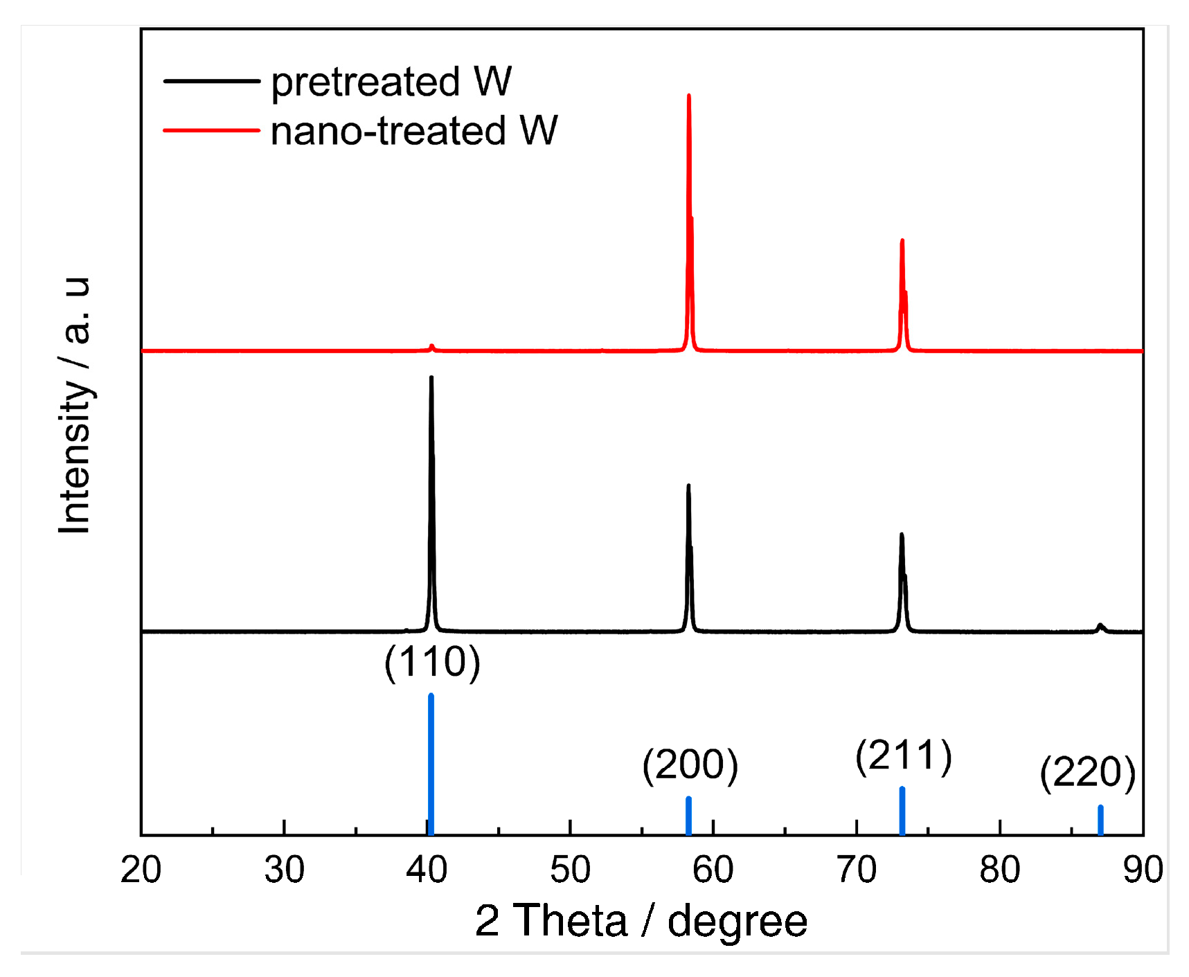 Figure 14. The XRD patterns of the W samples before and after nano-treatment.
