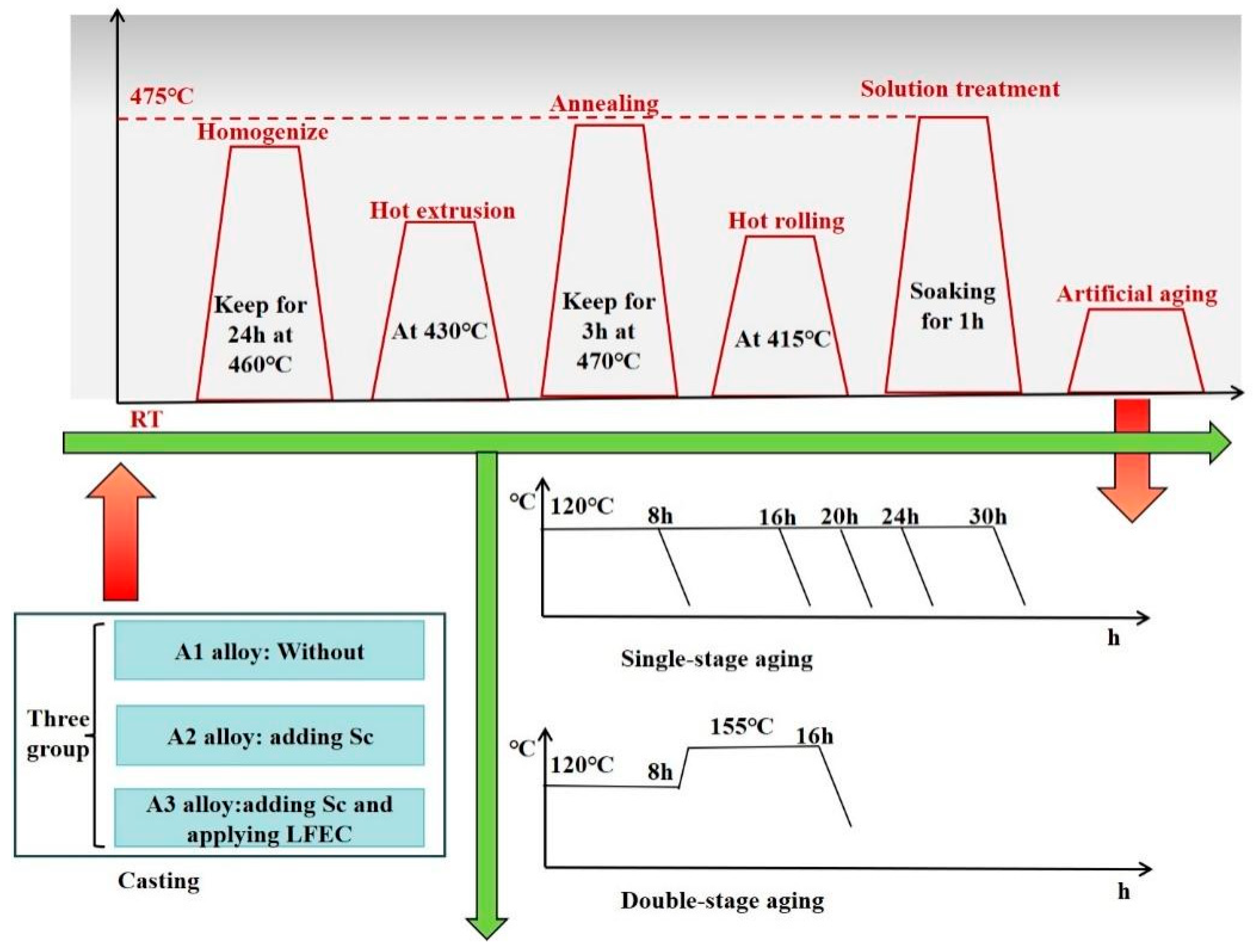 - Yang, L.; Yu, F.; Chen, C.; Xu, Y.; Song, Z.; Cui, J.; Wang, X. Bendability and ductility enhancement of 7A36 alloys through adding Sc and applying LFEC with a rapid solid solution heating rate treatment. J. Mater. Sci. 2023, 58, 13831–13853. [Google Scholar] [CrossRef]