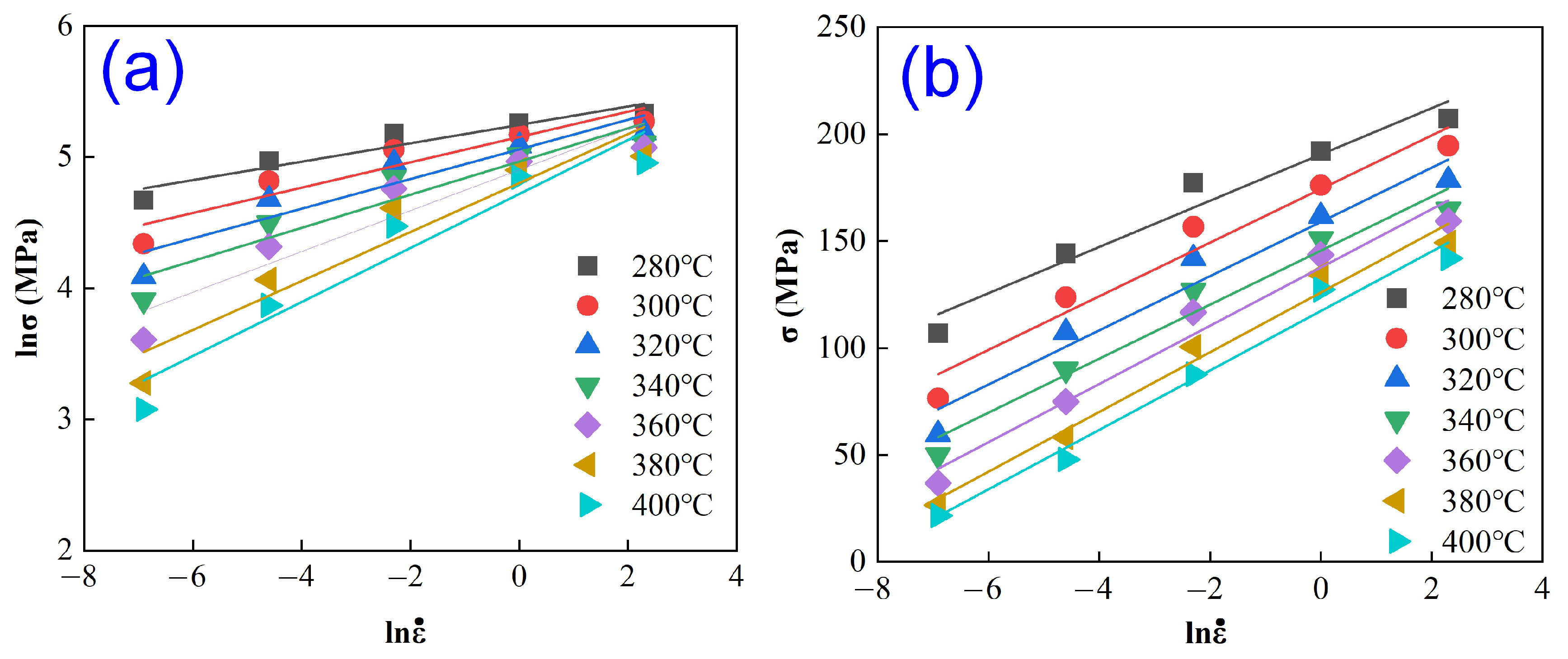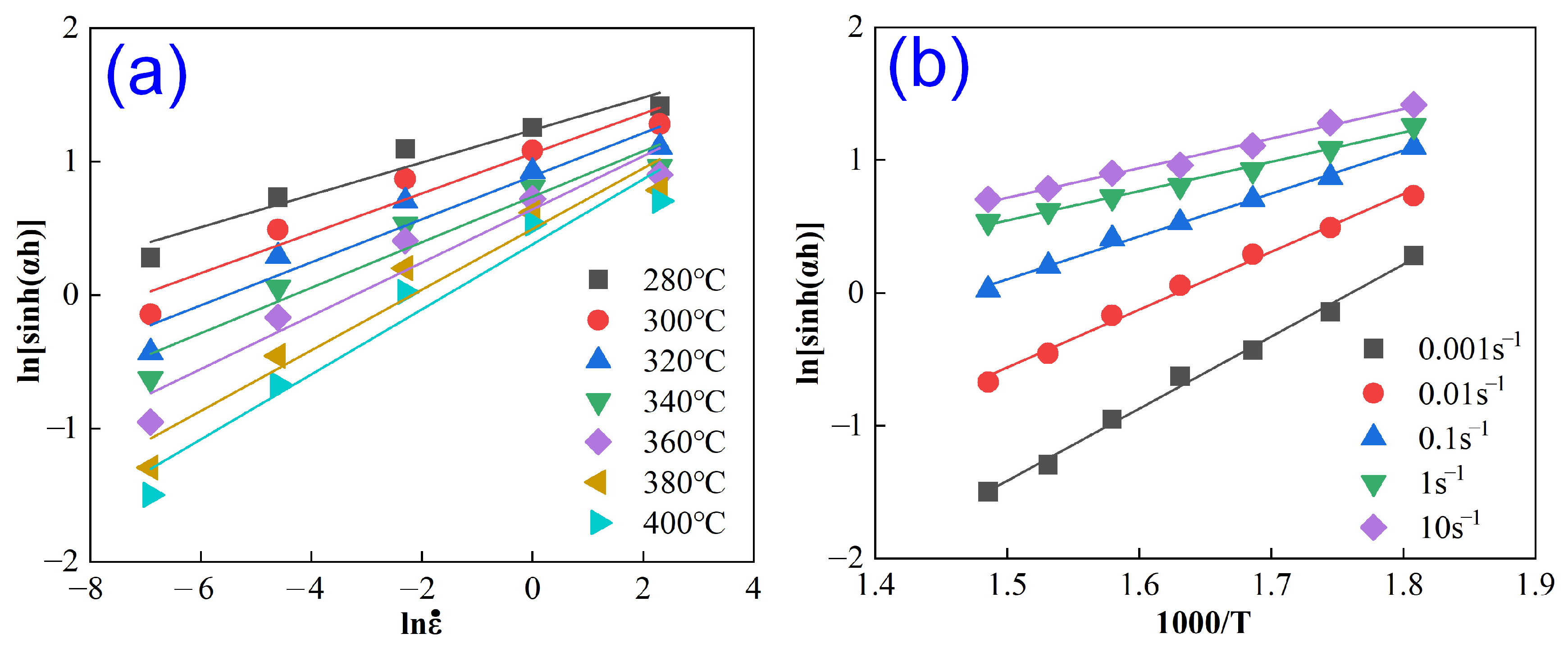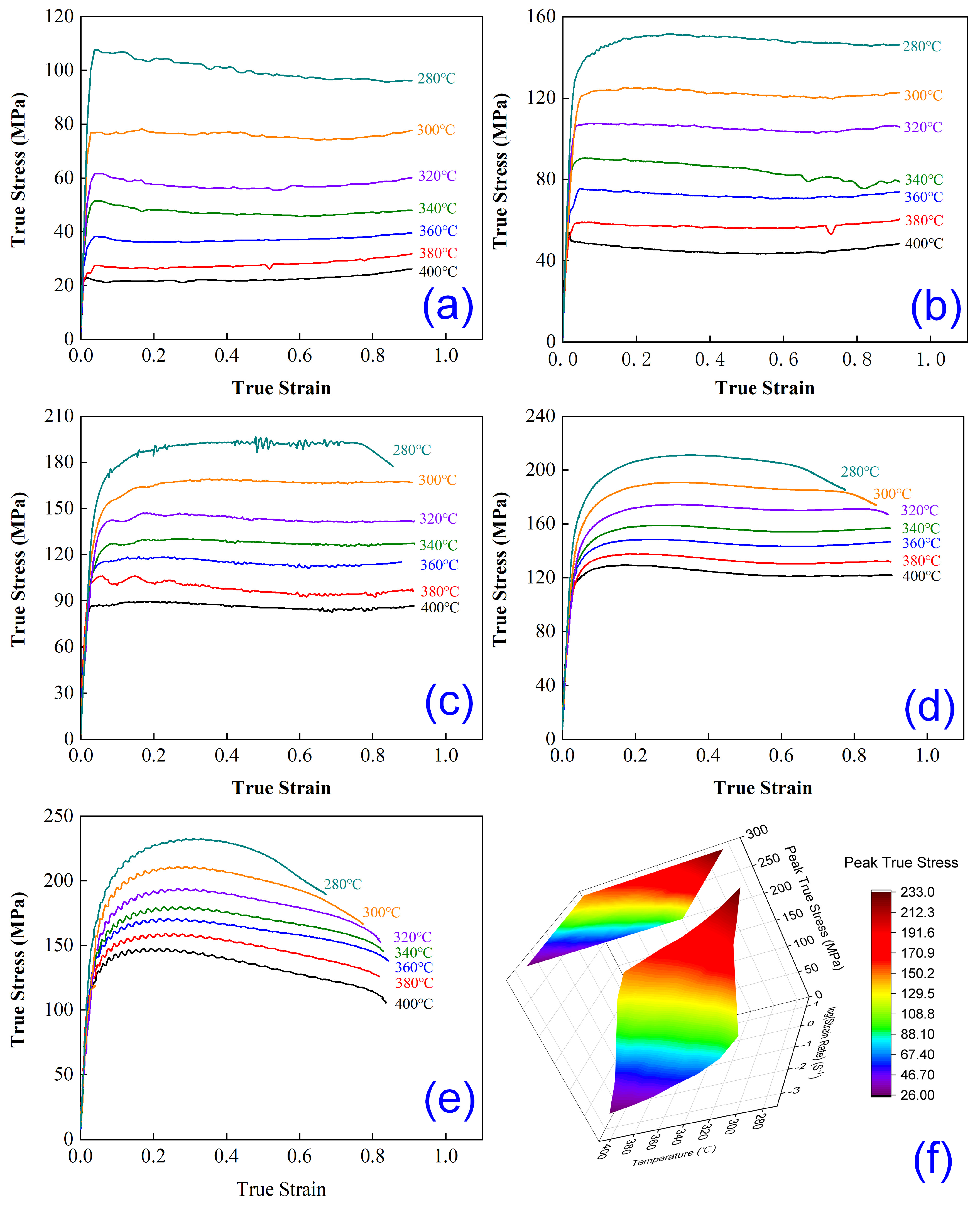 - At 280 °C with strain rates of 0.1~10 s−1, the flow stress declines gradually after reaching its peak.