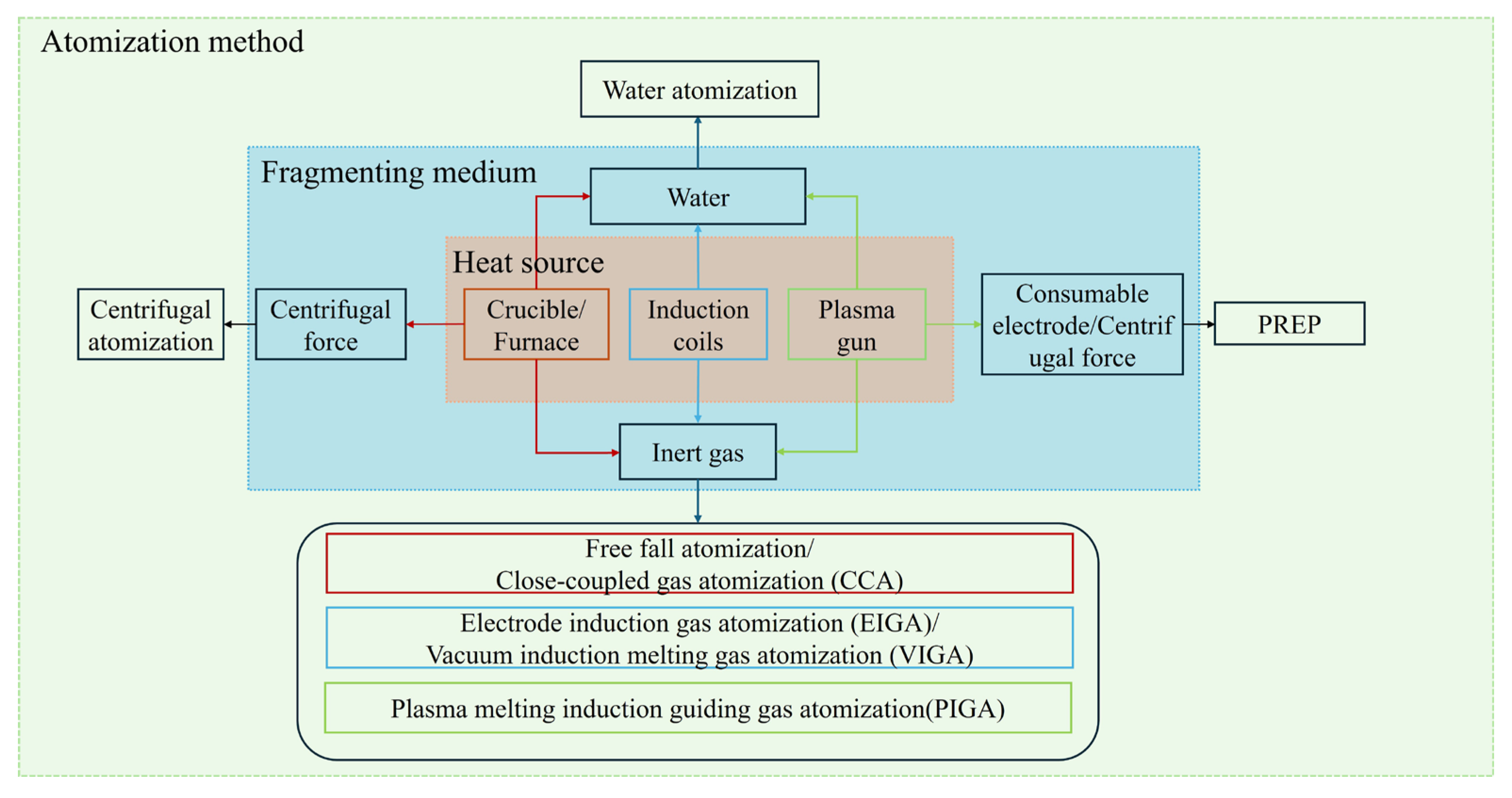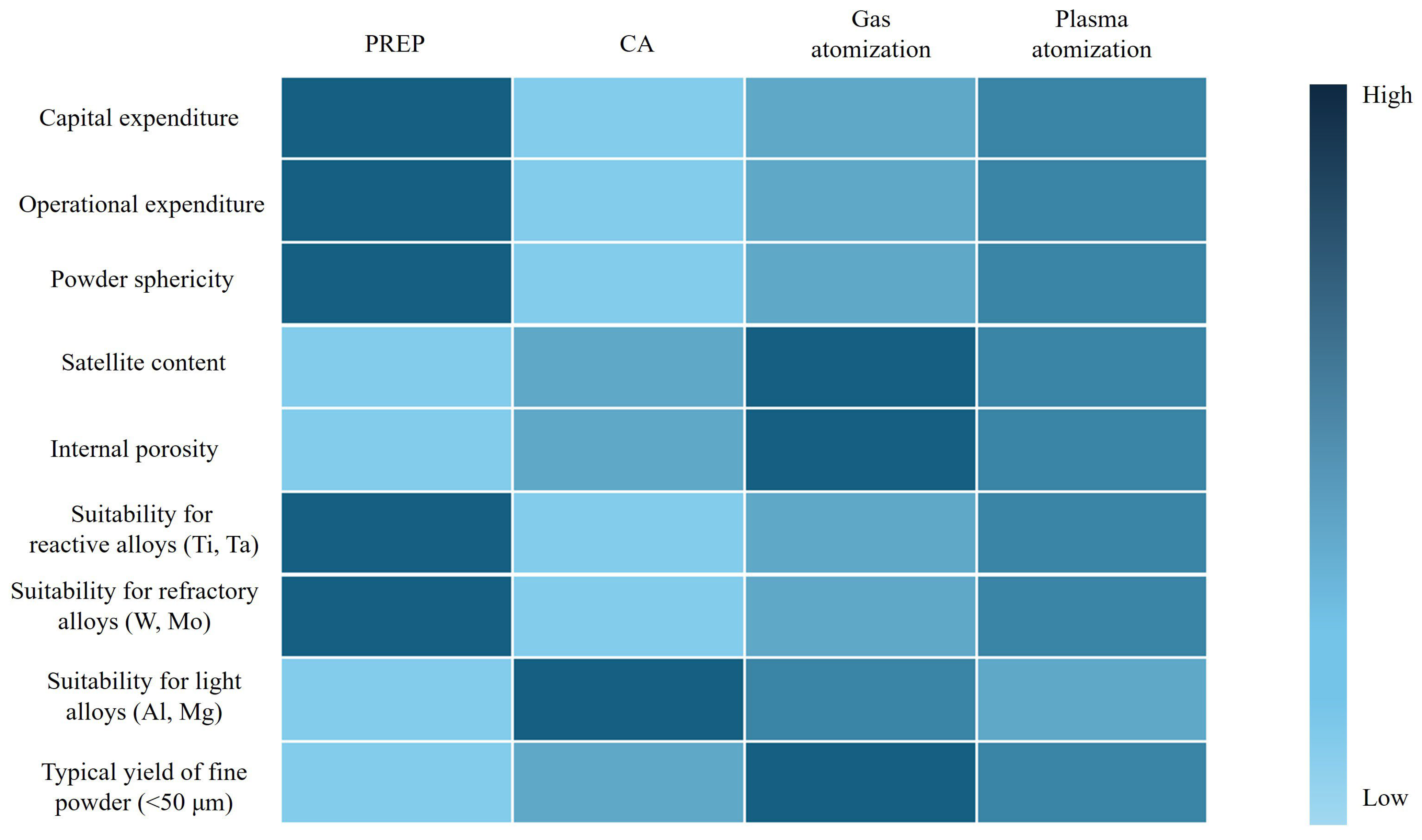 | PREP | Direct drop | Highly spherical, satellite-free powders. Premium applications require superior flowability. | [29,31,78,79,80,81] | |