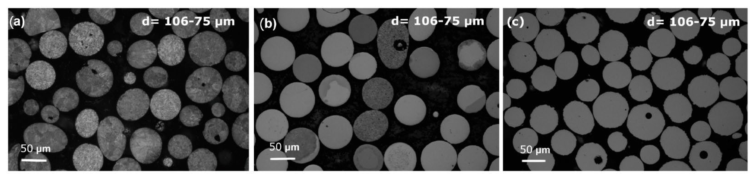 - Han, Z.Y.; Zhang, P.X.; Lei, L.M.; Liang, S.J.; Wang, Q.X.; Lai, Y.J.; Li, J.S. Morphology and particle analysis of the Ni3Al-based spherical powders manufactured by supreme-speed plasma rotating electrode process. J. Mater. Res. Technol. 2020, 9, 13937–13944. [Google Scholar] [CrossRef]