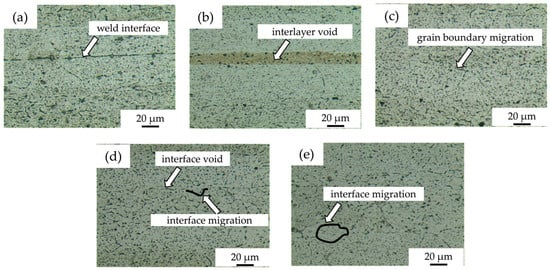 Figure 2a shows the microstructure of diffusion-bonded joints without powder interlayers, with obvious weld defects and a lower bond rate compared to the joints with powder interlayers. Figure 2b shows a joint obtained with a 50 nm Al powder layer, which appears fine with no powder grain boundaries and a high weld rate. The diffusion interface between aluminum powder and substrates forms effective metallurgical bonds, with minimal voids, and a higher Al concentration in the nano-aluminum layer facilitates atom diffusion, forming a denser interface. However, residual pores exist due to incomplete mixing and aggregation from viscosity effects of the residual antioxidant. Figure 2c–e display the microstructures of joint diffusion bonded with intermediate layers of 5 μm, 45 μm, and 75 μm 7075 alloy powders, respectively. The 5 μm 7075 powder interlayer shows no obvious interface voids, fewer and finer poles in the powder interlayer than the 50 nm Al. The dotted lines in Figure 2d,e indicate the fusion between the matrix grains and the powder interlayer, increasing the bonding interface quality. The grain boundaries are more obvious for the 45 μm and 75 μm 7075 alloy powder interlayers due to a larger grain size and fewer grain boundaries. The intermediate layer powder deforms and flows under pressure. Since the applied force is unidirectional and axial, it cannot guarantee full contact between the powders. Fine powder in the middle layer tends to agglomerate, creating isolated, closed voids. For larger powders, narrow, fine, curved holes can be observed along the grain boundaries.