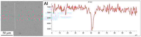 Figure 3, Figure 4, Figure 5 and Figure 6 illustrate the distribution of elements across the interface perpendicular to the diffusion joints 7B04 with various powder interlayers. The composition of the base material 7B04 and the intermediate layer 7075 powder was similar, with no formation of special phases or compounds. Figure 3 shows the element distributions at the joint without powder interlayers. It is clear that there is no difference in the distribution of Al elements on both sides of the base material. Al elements are detected in the middle weld area, but their concentration is significantly lower than that in the base materials on either side. This difference in Al concentration indicates mutual diffusion of elements at the interface and limited bonding. Additionally, Zn, Mg, and Cu elements are detected in the middle region. Figure 4 depicts the element distribution at the diffusion joint with a 50 nm Al powder interlayer. There is no significant change in Al content from one side of the base material to the powder interlayer and then to the other side. The concentration differences during the diffusion bonding process facilitate the diffusion of Al. Simultaneously, small amounts of Zn, Mg, and Cu diffuse into the powder interlayer. Variations in element concentration promote mutual atomic diffusion at the interface, increase the diffusion bonding flux, and enhance metallurgical bonding between the powder interlayer and the base material. From Figure 5, it is evident that the Al content in the powder interlayer is slightly higher than in the base material. Mg and Zn are present in the middle layer, with Mg diffusing into the middle layer more extensively than Zn, due to its higher diffusion coefficient in Al. Figure 6 shows the element distribution of the joint with a 50 nm 7075 powder interlayer. The Al content remains relatively uniform along the line scan; the two areas with reduced Al might be sites of material pit defects. There is no clear pattern or characteristic of elemental diffusion, and the alloying elements are gradually homogenized throughout the entire joint interface. Similar element distribution results were obtained for 7B04 joints with 45 μm and 75 μm 7075 powder interlayers. Additionally, it is notable that the oxygen content at the diffusion interface is very low, indicating that the base metal and powder are well protected during diffusion bonding oxidation.