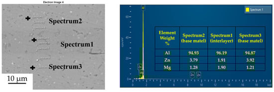 The LSS test specimen is shown in Figure 1. A UTM 5504X electronic universal testing machine (SUNSTEST Inc., Shenzhen, China) was used for the non-standard LSS test. The test speed is 1 mm/min. No anti-bending fixture was used because the lap length is only 1.4 mm, which was determined through prior experiments to guarantee fracture in the overlap area. For each experimental condition, a minimum of three valid replicates were tested. After tensile testing, the LSS specimens were ultrasonically cleaned in an acetone solution. The fracture surface was then examined using a Regulus 8220 (Hitachi High-Tech Corporation, Tokyo, Japan) scanning electron microscope (SEM). Meanwhile, the interface of the joint was scanned by point and line using an energy dispersive spectrometer (EDS) to analyze element diffusion at the interface between the base material and the intermediate layer.