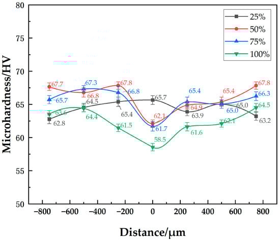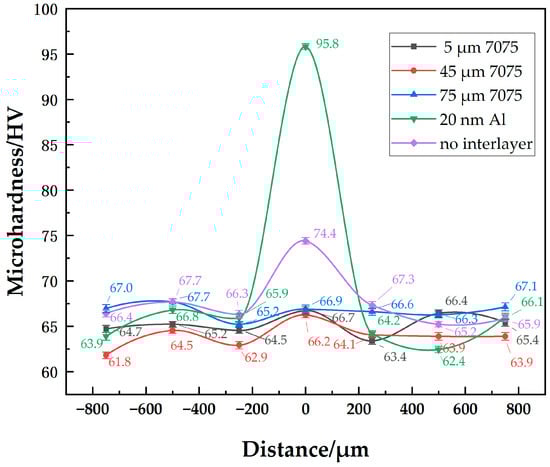 The microhardness distribution of the 7B04 joints with mixed Al/7075 powder interlayers of different mass ratios is shown in Figure 11. As the Al/7075 powder mixture ratio increases, the powder interlayer’s hardness decreases. The lowest microhardness was 58 HV at a 100% mixed ratio, showing no significant decrease compared to the powder interlayer microhardness of 7075 powder at around 65 HV. The decrease in microhardness observed with the mixed Al/7075 powder interlayer, especially as the proportion of soft, micro-sized Al powder increases, is due to a different mechanism. The 7075 alloy powder itself has a hardness similar to the 7B04 base metal. However, the incorporated pure Al powder (1 µm) is significantly softer. As the mixing ratio of Al powder increases, the overall hardness of the powder interlayer composite decreases because the softer phase (Al) governs the mechanical response, leading to a lower average microhardness value. The microhardness values of base metal with different mixed Al/7075 powder interlayers range from 61.5 to 67.8. Material inhomogeneity and systematic measurement errors are fundamental factors contributing to the differences in the base metal microhardness.