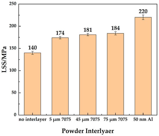 As shown in Figure 8, the LSS of the joint without an powder interlayer was 140 MPa. The shear strength of the joint with the 5 μm 7075 powder interlayer was 174 MPa, slightly lower than that of the 45 μm and 75 μm powder interlayers, which were 181 MPa and 184 MPa, respectively. The joint with the 50 nm Al powder interlayer has the highest LSS, reaching 220 MPa, due to its higher density. The thickness difference before and after bonding was measured. The thickness of the LSS sample was measured by micrometer with an accuracy of ±1 µm before and after DB (t1 and t2). The deformation rate was calculated (t1 − t2)/t1 × 100%. The deformation rates along the thickness direction were less than 6%, as shown in Table 3. The overall deformation of the bonding sample was small and met the requirements.