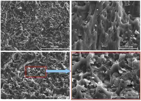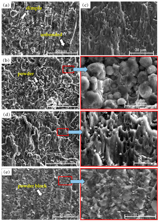 Figure 9b shows the fracture morphology of the shear specimen with a 5 μm 7075 powder interlayer. Fracture failure occurred at the interface between the powder interlayer and the base material, displaying a mixture of dimples and dissociations. The powder bonded to the matrix was separated from the base material under shear stress, forming equiaxed dimples. Many powders have not separated from the base material, indicating higher bonding strength. Some powder particles have equiaxed dimples facing different directions. The magnified image shows that the dimples vary in size and depth. The formation mechanism of the dimples is mainly void aggregation fracture in the unbonded locations. Although the powder interlayer of 7075 in metallographic Figure 2c has achieved metallurgical bonding, powder agglomeration causes the overall density to be low, leaving many voids between the powders. When the shear specimen is subjected to shear stress, these unclosed voids will expand, and the cross-sectional area between adjacent voids will shrink, connect, and merge to form new voids, eventually leading to a dimple that results in ductile fracture.
