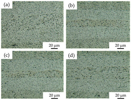 Microstructures of 7B04 diffusion joints with different Al/7075 powder mix ratios obtained at process parameters of 515 °C—7.5 h—4.4 MPa are shown in Figure 10. In Figure 10a, with a mixing ratio of 25%, no obvious Al powder was observed at the diffusion interface. The grain boundaries between the 7075 aluminum alloy powders are weakened, and small voids remain in the powder interlayer. Compared to the microstructure of the joint without Al powder, the interface voids are reduced. In Figure 10b, with a 50% mix ratio, 7075 powder is surrounded by Al powder with no obvious grain boundaries. The interface voids between the powder interlayer and the base material are significantly decreased. The Al powder is mainly aggregated due to uneven distribution during manual coating, resulting in some tiny voids and agglomeration. The metallographic microscopic characteristics of the joints at 75% and 50% mix ratios are similar. In Figure 10d, at a 100% mix ratio, neither Al nor 7075 powder is particularly prominent. The entire diffusion surface is more uniform, with small voids still present but fewer in number.