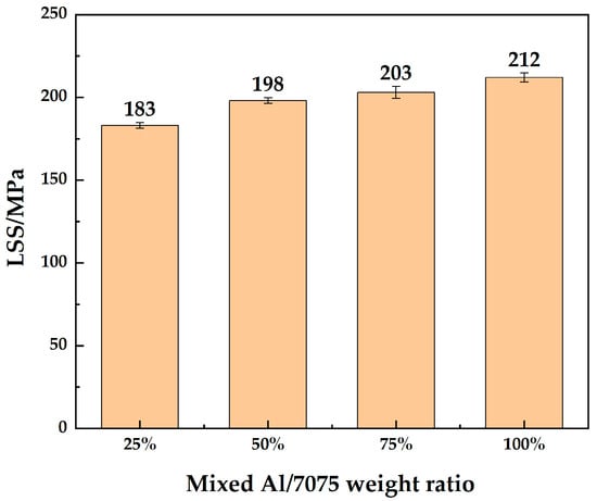 LSS of 7B04 joints with mixed Al/7075 powder interlayers of different weight ratios.