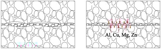 Oxide films mainly composed of Al2O3, which have a high melting point, are the primary obstacle to atom diffusion, as they inevitably form on aluminum alloy surfaces exposed to the atmosphere []. One way to overcome this diffusion barrier is through surface treatment and a vacuum or inert gas environment []. Huang et al. [] developed a new surface treatment method where the surfaces to be joined were coated with an organic solution immediately after removing surface oxides for DB and obtained promising results under optimized bonding conditions. Zuruzi et al. [] used SiC paper and subsequent ultrasonic cleaning in acetone for 5 min to disrupt the surface oxide layer, and the ultimate tensile strength and linear bonded ratio of 6061. Shirzadi et al. [] used emery paper grinding containing a small amount of liquid gallium to replace the oxide film with a thin metallic layer and/or less stable oxides, which resulted in bonding strength similar to the parent 6082 aluminum alloy. Wu et al. [] applied dehydrated alcohol for air isolation after chemical etching of AA8090, and the DB was performed in a salt bath. A vacuum [] or protective atmosphere [] can effectively prevent oxidation of the joining surfaces, demonstrating promising outcomes in experimental and practical applications.
