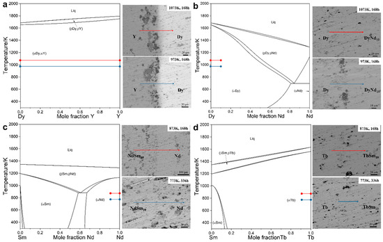 To overcome these drawbacks, partial substitution of Nd by other rare-earth (RE) elements, particularly heavy rare-earths (HREs) such as Dy and Tb, has been extensively explored as an effective strategy [7,8,9,10,11]. HREs diffuse along grain boundaries [12,13,14] to form HRE-rich shells on the surfaces of Nd2Fe14B grains [1,15,16]. These shells effectively inhibit reverse magnetic domain expansion, enhance coercivity, and reduce remanence loss [17]. Although HRE diffusion improves coercivity, excessive diffusion leads to the formation of overly thick non-magnetic shells, which can significantly reduce remanence and the maximum energy product [18]. Therefore, precise control over the concentration gradient of diffusing elements is essential to achieving both high coercivity and high remanence [19]. However, studies on interdiffusion coefficients and kinetic databases for rare-earth elements (e.g., Dy-Y, Dy-Nd, Sm-Nd, and Sm-Tb) remain limited.