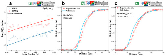 (a) Calculated interdiffusion coefficients together with experimental measurements. (b,c) Concentration profiles for Dy-DyNd10 annealed at 973 K and 1073 K for 168 h.