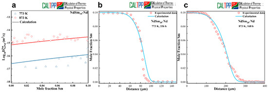 (a) Calculated interdiffusion coefficients together with experimental measurements. (b,c) Concentration profiles for Nd-NdSm10 annealed at 773 K for 336 h and 873 K for 168 h.