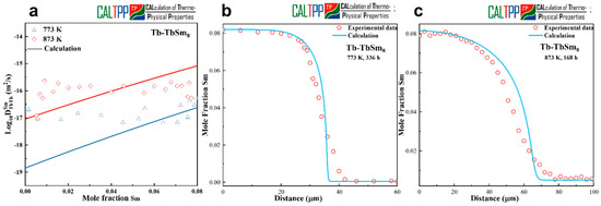 (a) Calculated interdiffusion coefficients together with experimental measurements. (b,c) Concentration profiles for Tb-TbSm8 annealed at 773 K for 336 h and 873 K for 168 h.