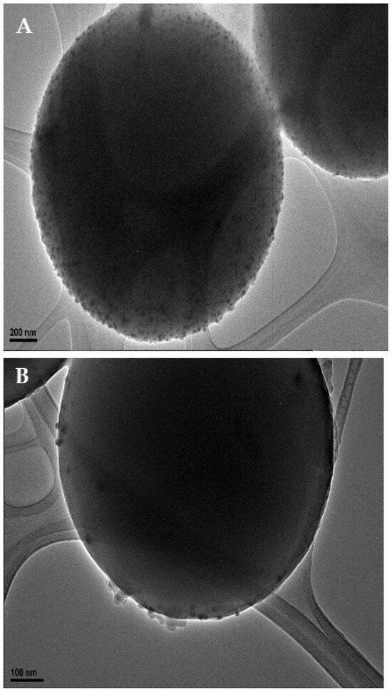 38]. These data further support the presence of silver in our samples. The average crystallite size estimated from XRD using the Scherrer equation is ~14 nm, while TEM analysis indicated an average particle size of ~12 nm. The close agreement between these two techniques supports the reliability of the measurements and suggests that the particles are largely crystalline with minimal amorphous content. Minor differences are expected: XRD reflects the size of coherent diffracting domains, which may slightly overestimate size if the particles are polycrystalline, whereas TEM provides direct imaging of overall particle dimensions, including both crystalline and amorphous regions. The 2 nm discrepancy falls within typical experimental uncertainty and indicates that the silver nanoparticles are nearly single-crystalline, with TEM and XRD giving consistent size evaluations.