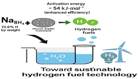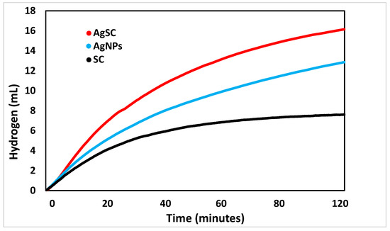 2 after 120 min. In contrast, unsupported AgNPs produced a higher volume of hydrogen, approximately 12.9 ± 0.5 mL after 120 min. The AgSC composite, however, demonstrated the highest activity, yielding 16.1 ± 0.5 mL of hydrogen under identical conditions [
