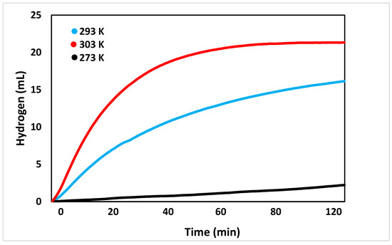 Figure 5. At first, the reaction was tested at 293 K. This temperature was observed to produce roughly 2.2 ± 0.5 mL of hydrogen after two hours. Increasing the temperature of the reaction to 293 K greatly increased the volume of hydrogen produced to 16.2 ± 0.5 mL. As suspected, increasing the reaction temperature to 303 K further increased the volume of hydrogen, with two hours of reaction time producing 21.3 ± 0.5 mL. These results indicate that the reaction is endothermic.