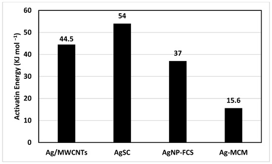 Figure 7). The AgSC catalyst in this study was observed to have the highest activation energy of 54 kJ mol