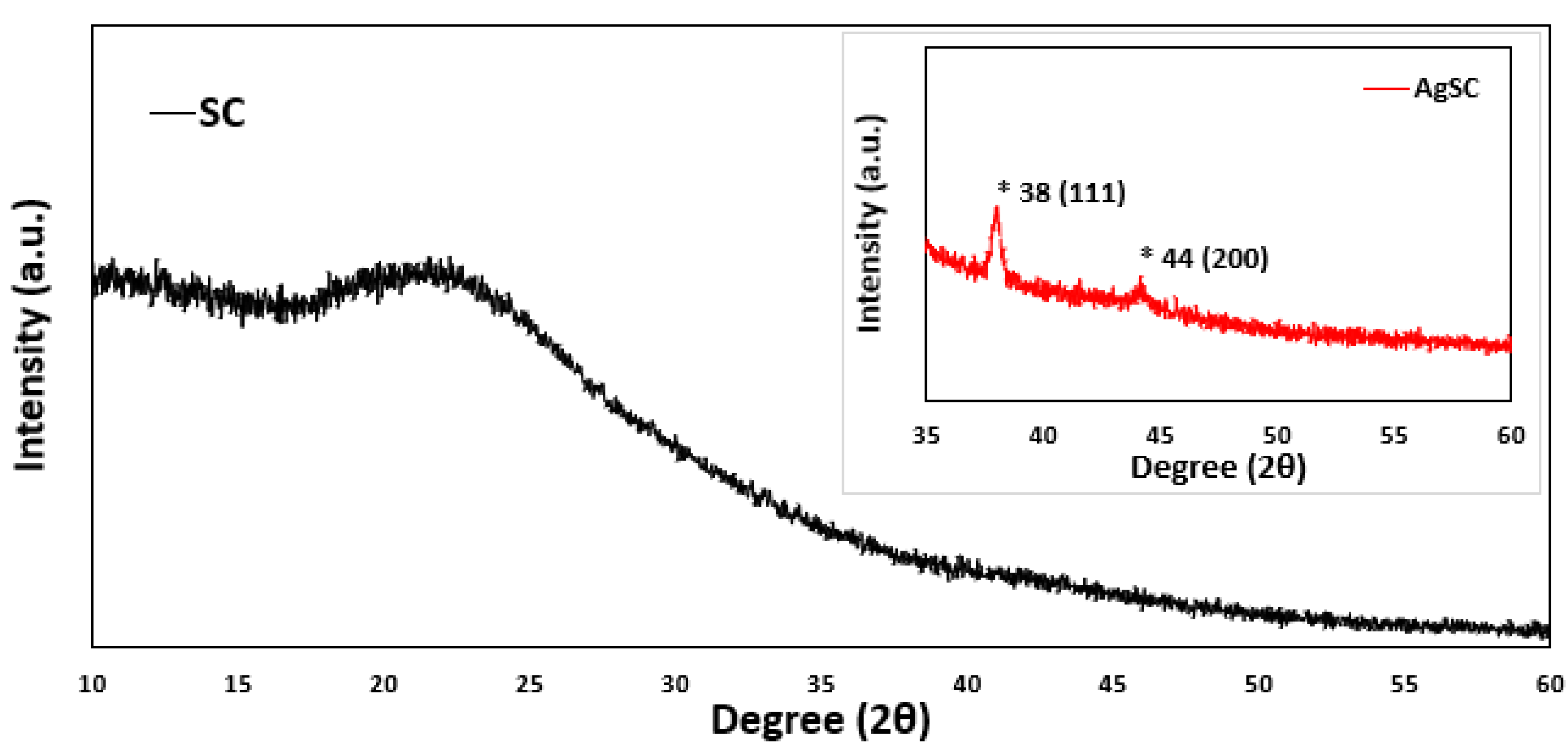 Figure 3. In both samples, there is an obvious broad peak seen around 20–25 degrees. These peaks are commonly seen in carbon-based materials and can be attributed to the SC material of both samples. Two peaks are present in the AgSC sample that cannot be seen in the plain SC sample at roughly 38 degrees and 44 degrees. These two peaks are likely indicative of the (111) and (200) face centered cubic (FCC) structure of silver nanoparticles with slight shifting (International Centre for Diffraction Data, ICDD 65-2871). This shifting is not significant and has been observed before as indicating a change in the lattice structure of the material [