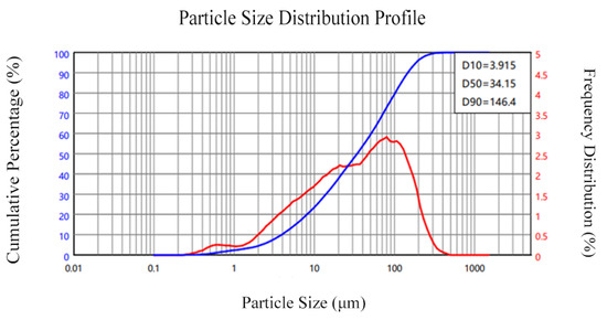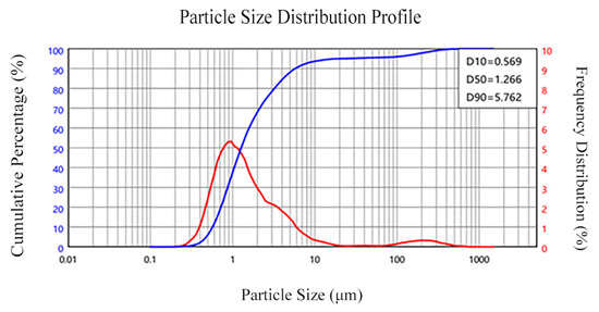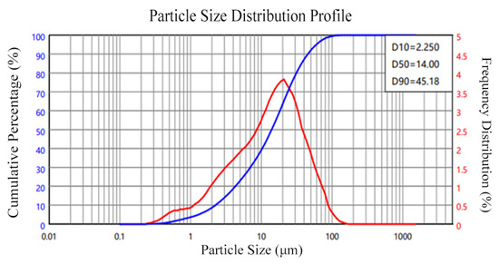 The following test material was acquired: OPC is ordinary Portland cement with a density of 3.03 g/cm3; the particle size distribution of the cement is shown in Figure 1. Fly ash was grade I fly ash, and its apparent density was 2.4 g/cm3; the particle size distribution of the fly ash is presented in Figure 2. The apparent density of silica fume was 2.232 g/cm3; the particle size distribution of silica fume is illustrated in Figure 3. And the oxide composition of the three materials is shown in Table 1. The use of fly ash and silica fume in ECC can reduce the cost of materials and increase the self-compacting and working performance of ECC when used in large quantities [17,18]. The mechanical and geometric properties of UHMWPE and BFs are shown in Table 2. Quartz sand exhibited a mean particle size distribution ranging from 0.09 to 0.12 mm, and its density was 2.654 g/cm3. A polycarboxylate-based high-range water reducer was employed as the chemical admixture; water was ordinary tap water.