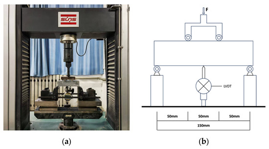 Four-point bending test setup: (a) four-point bending test loading method; (b) geometric dimensions.