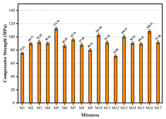 The compressive strength of hybrid fiber ECC was measured at the curing age of 28 d. The compressive strength trend is illustrated in Figure 6. The maximum recorded compressive strength reached 112.36 MPa. Ratio M5 had the lowest water-to-binder ratio of 0.2 in the design. The contents of UHMWPE and BFs were 1.2% and 0.8%. At this time, the internal pores of the material were low and relatively dense. In the cases of different particle sizes, the pores formed between different particles were filled with finer particles [23]. This demonstrates superior compressive strength compared to the other components. In comparing components M6 and M17, under the same water-to-binder ratio and BF content, the UHMWPE fiber increased from 0.8% to 1.6%, and the compressive strength increased by 6.0%. The observed variations among M5, M7, M15, and M16—all with the same water-to-binder ratio—primarily arise from the synergistic effects of basalt fiber (BF) and UHMWPE fiber content. An increase in BF content refines the pore structure, thereby enhancing compressive strength, while a moderate rise in UHMWPE content improves strength through its high tensile properties. However, excessive total fiber content may reduce overall compactness and cause fiber agglomeration, leading to decreased strength. Specifically, M16 exhibits higher strength than M5 due to the increased proportion of pore-refining BFs at an optimal UHMWPE level. In contrast, M7 suffers from fiber agglomeration and porosity caused by high UHMWPE content, while M15 experiences insufficient BF activation and low UHMWPE contribution; these factors collectively contributed to the reduction in compressive performance. When the specimen was subjected to axial load, the compressive bearing surface of the specimen was slightly reduced, and a slight lateral displacement was generated. The fiber bridging effect effectively constrained the lateral displacement of the specimen, thereby sharing part of the axial pressure and improving the compressive strength of the specimen [24]. The lowest compressive strength was 70.89 MPa. Component M12 had the highest fiber content; UHMWPE and BF were both 1.6%. Relative to M14 and the reference component, under a constant water-to-binder ratio and UHMWPE content, a 21.6% reduction in compressive strength was observed with increasing BF content. When a low water-to-binder ratio was maintained, excessive fiber content was not conducive to its uniform dispersion, resulting in agglomeration in the matrix. This process effectively reduces the material’s compressive strength, as it is equivalent to introducing defects into the matrix The compressive strength model relationship was established through response surface analysis of each factor, as shown in Equation (3).