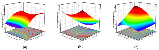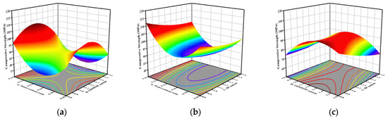Compressive strength values across the parameter domain are calculable using Equation (3). Figure 7 is a 3D response surface diagram of the two-factor interaction of compressive strength. Figure 7a demonstrates the interactive effect of factors A and B on compressive strength. At fixed levels of A, the compressive strength displays a non-monotonic response to increasing B, characterized by an initial decline followed by subsequent recovery, which produces distinct curvature in the response surface. A and B play a controlling role in the compressive strength. Figure 7b shows that the response surface curvature of compressive strength is lower than that of A and C, and their interaction remains statistically insignificant. Figure 7c shows the interaction between B and C, and the response surface diagram is obviously warped. At this time, the main factor affecting the compressive strength is B.