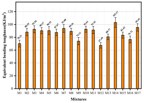 At the curing age of 28 days, measurements were taken for the equivalent bending toughness of the ECC, and the variation range was 67.49–103.17 KJ/m3, as shown in Figure 10. The M14 mix proportion demonstrates optimal energy absorption characteristics throughout the loading process. The ratio has an intermediate level of the water-to-binder ratio and the highest UHMWPE content in the design, which were 0.25 and 1.6%, respectively. Compared with other components, the equivalent bending toughness was reduced when the material components were increased or reduced. Compared with component M1, the content of UHMWPE fiber decreased by 0.8%, and the equivalent bending toughness decreased by 32.0% under the same water-to-binder ratio. Compared with M12, the content of BF increased by 0.8%, and the flexural toughness decreased by 34.6%. The equivalent bending toughness was affected by the fiber, bulk matrix behavior, and fiber–matrix interfacial zone properties. When specimens were loaded in the four-point bending configuration, the synergistic effect between the matrix and the fiber realized high energy absorption during the loading process. With the regulation of fiber dispersion and stress tip distribution, water-to-binder ratios and fiber contents that are either too high or too low alter the toughness of the matrix. Furthermore, with an optimized water-to-binder ratio and fiber dosage, the fiber continues to increase more than the optimal content, which will cause fiber agglomeration and deterioration of distribution uniformity [26]. At the same time, excessive fibers will increase the porosity of the matrix, destroy the dense structure of the matrix, and ultimately lead to a decrease in the mechanical properties of the specimen. Finding the optimal water-to-binder ratio and fiber content is crucial in the preparation of hybrid fiber ECC specimens, as it enables the achievement of a balanced state for the material’s flexural toughness. Through the application of Response Surface Methodology to each variable, the bending toughness model relationship is established, as shown in Equation (5).
