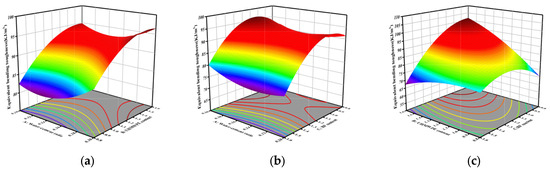 Three-dimensional response surface plot of the interaction between two factors in equivalent bending toughness strength: (a) AB interaction; (b) AC interaction; (c) BC interaction.