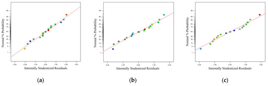 Normal plot of residuals: (a) compressive strength; (b) flexural strength; (c) equivalent bending toughness.