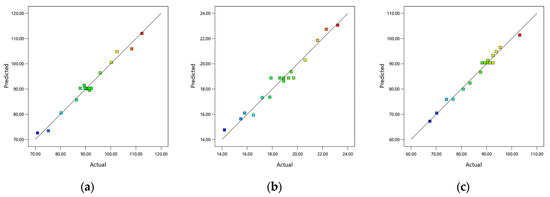 The correlation coefficients R2 between experimental and predicted values are 0.9790, 0.9653, and 0.9835, respectively, as presented in Table 8 for model reliability assessment, demonstrating their close approximation to the ideal value of 1. The difference between the R2 and adjusted R2 values for each response is less than 0.2. The model achieved a coefficient of variation below 10 and a signal-to-noise ratio above 4. This shows that the reliability and accuracy of the regression equation are high, which can meet the fitting of the actual situation of the test. The residual distribution is shown in Figure 12, which is used to evaluate the normality hypothesis of the residual distribution. The significant relationship within the regression model equation involving the water-to-binder ratio and fiber content is confirmed by the even distribution of the scatter points in the graph. Figure 13 shows that the close agreement between experimental and predicted values, along with their linear distribution, demonstrates the high reliability of the regression model in predicting response values and its capability to accurately forecast experimental outcomes.