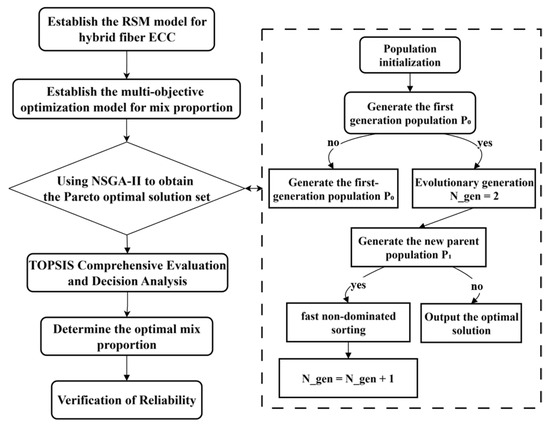 Furthermore, the mix design of hybrid fiber-reinforced ECC must comprehensively account for the complex interactions among multiple factors, including the water-to-binder ratio and fiber content. Traditional trial-and-error approaches are often inadequate for efficiently elucidating the underlying mechanisms. Therefore, it is imperative to develop a more effective and precise design methodology. To address the complex interactions inherent in the aforementioned mix design and to establish an effective and precise design methodology, this study was conducted using Response Surface Methodology. Furthermore, a multi-objective optimization of the ECC mix proportion was achieved by employing the NSGA-II algorithm in combination with the TOPSIS comprehensive evaluation method. This approach provides a valuable reference for the design optimization of ECC mixes tailored to diverse strength and toughness requirements.