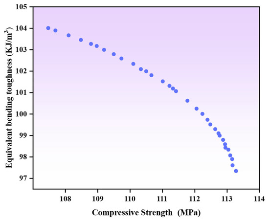 The established framework, which comprises prediction models for the compressive strength and equivalent bending toughness of hybrid fiber-reinforced high-ductility cementitious composites, serves as the basis for the subsequent analysis. The NSGA-II algorithm is employed for multi-objective optimization. The parameter settings are specified as follows: with crossover and mutation probabilities set at 0.9 and 0.1, respectively, the algorithm configuration also includes a population size of 50 and a maximum of 200 iterations. The Pareto front solution set obtained by the optimization calculation is shown in Figure 15. The solution set quantitatively characterizes the internal constraint relationship between the two key performance indicators of compressive strength and equivalent bending toughness. The Pareto front clearly shows that there is no single design scheme that can maximize compressive strength and equivalent bending toughness at the same time. The fact that no single solution can simultaneously optimize both objectives to their respective ideal values indicates a non-negligible trade-off relationship between the two performance metrics.