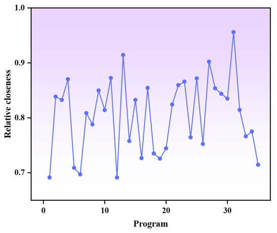 From the Pareto optimal solution set, 35 representative solutions were evaluated using the TOPSIS method to identify the hybrid fiber ECC ratio with the best comprehensive performance. This method computes the Euclidean distance between each solution and the positive/negative ideal solutions, deriving a relative closeness value (0–1, where values closer to 1 indicate better performance) to comprehensively assess both compressive strength and equivalent bending toughness. As shown in Figure 16, the highest closeness of the 31st group scheme is 0.956, and the corresponding mix ratio as follows: a water-to-binder ratio of 0.21, UHMWPE fiber content of 1.51%, and BF content of 0.85%. This indicates that the group achieves optimal balance between strength and toughness.