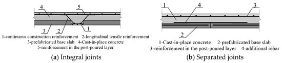 Prefabricated structures have been widely adopted in practical engineering in recent years due to their high production efficiency and environmental friendliness [1,2,3]. The reinforced concrete composite floor slab is an important horizontal structural component in prefabricated buildings, consisting of prefabricated base plates and post-poured concrete [4]. Due to size limitations and transportation constraints, joints are inevitable during the construction of composite panels, and their load-bearing performance directly determines the overall structural performance of the floor slab.