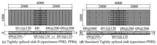 Each specimen measured 4000 mm in length and 1000 mm in width. The prefabricated base slab of the composite panel was 2000 mm long and 1000 mm wide. In accordance with the national standard (JGJ1-2014) [5], the thickness of the bottom plate was set to 60 mm. Figure 3 illustrates the schematic construction of each specimen. Specimens PFB1 and PFB2 represent Tightly Spliced Slabs I (Figure 3b), with a 50 mm horizontal bending section provided at the end of the inclined reinforcement in the base slab at the joint. A row of stirrups connected to the bottom plate reinforcement was embedded within the prefabricated bottom plate as shear reinforcement. Specimens PFB3 and PFB4 represent Tightly Spliced Slabs II (Figure 3c), incorporating diagonal straight reinforcement in the base slab. Concrete ribs were cast on the top surface of the prefabricated base slab, and based on the experimental findings in reference [7], rectangular ribs were adopted. Only one stirrup bar was installed on each side of the joint, hooked below the base slab reinforcement. PFB5 is a standard tightly spliced slab (Figure 3d). The details of the stirrups for specimens PFB1–PFB5 are shown in Figure 4a.