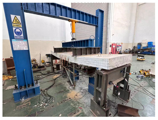 The experiment employed a hydraulic jack to apply two-point static loads through a loading beam positioned at the quarter points of the specimen, with simply supported boundary conditions at both ends, as illustrated in Figure 5. According to the Standard for Test Method of Concrete Structures (GB/T 50152-2012) [20], the test procedure was divided into two stages: preloading and formal loading. During preloading, a force of 2 kN was applied to each specimen to verify the proper functioning of all measuring instruments. In the formal loading stage, force-controlled graded loading was applied at a loading rate of 0.5 kN/s. Prior to cracking, each loading increment was 2 kN; after cracking, each increment was increased to 5 kN; and after yielding, each increment returned to 2 kN. At each loading level, the load was maintained for 5 min to allow for data stabilization, after which deflection readings and crack mapping were recorded. Loading was terminated once the concrete in the compression zone of the specimen was crushed, marking the end of the test.