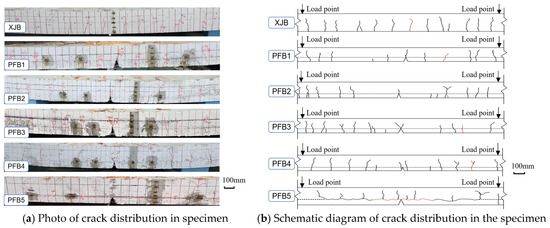 Figure 8 illustrates the side crack distribution of the Cast-in-Place Slab (XJB) and specimens PFB1–PFB4 at a deflection of L/50 (where L represents the specimen span), as well as the side crack pattern of specimen PFB5 upon brittle failure. The results show that the Cast-in-Place Slab (XJB) and the tightly spliced composite slabs (PFB1–PFB4) exhibited flexural ductile failure, whereas the standard tightly spliced composite slab (PFB5) experienced interface tearing, characteristic of brittle failure.