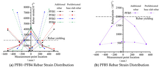Figure 11a shows that the strain distribution patterns of the additional rebar and base slab rebar in specimens PFB1–PFB4 are generally consistent. Within approximately ±200 mm of the joint, the additional rebar reached the yield strain, whereas the base slab rebar remained below its yield limit. Beyond this region, the strain in the base slab rebar exceeded that of the additional rebar and reached the yield strain. These observations indicate that a certain degree of interfacial slip between the new and old concrete layers is inevitable within the ±200 mm region from the joint in both proposed composite slab types. Consequently, full strain compatibility between the additional and base slab rebars within the same cross-section is not achieved—the strain in the additional rebar located above is greater than that in the base slab rebar. However, beyond this region, the strain in the base slab rebar surpasses that in the additional rebar, implying that at greater distances from the joint, the slip effect gradually diminishes without causing interface tearing. This behavior demonstrates that minor slippage is effectively counteracted by the shear resistance at the composite interface, ensuring reliable force transfer between the additional and base slab rebars. From these results, it can be concluded that, to ensure the safety and reliability of the structure, the length of the additional rebars in the two types of inclined-reinforced composite slabs should not be less than 400 mm, and the distance between the first stirrups on either side of the joint and the joint itself should be less than 200 mm.