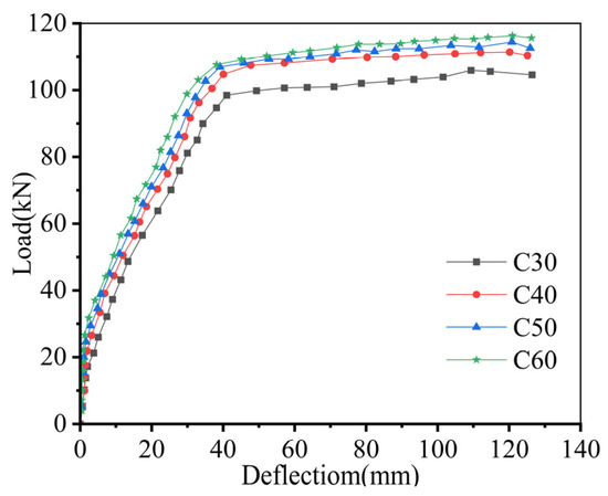 The concrete strength of the composite layer in specimen PFB4 was varied from C30 to C40, C50, and C60. Figure 15 presents the corresponding load–deflection curves for each concrete strength. The flexural capacity of the composite slab increases progressively with higher concrete strength in the composite layer. Increasing the strength from C30 to C40 results in an approximate 10% improvement in flexural capacity, whereas further increases from C40 to C50 and C60 produce only 2.4% and 4.6% improvements, respectively.