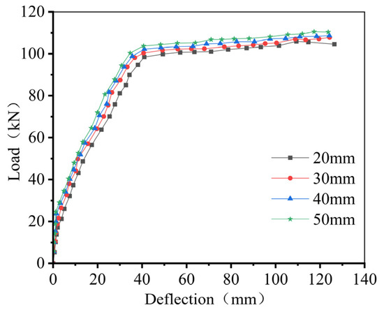Increasing only the rib height of the base slab in the Ribbed Diagonal-Reinforced Tightly Spliced Slab, while keeping all other parameters constant, produced the load–deflection response shown in Figure 16. The simulation results indicate that increasing the rib height slightly enhances the flexural capacity of the composite slab. However, raising the rib height from 20 mm to 50 mm results in only a marginal increase in bearing capacity of approximately 4.1%, suggesting a limited effect on the overall flexural performance. Combined with the observations in Section 3.1, these findings indicate that a rib height of 20 mm is sufficient to effectively restrain horizontal propagation of side cracks along the composite interface. Therefore, it is recommended that the base slab rib height in the Ribbed Diagonal-Reinforced Tightly Spliced Slab be set at 20 mm.