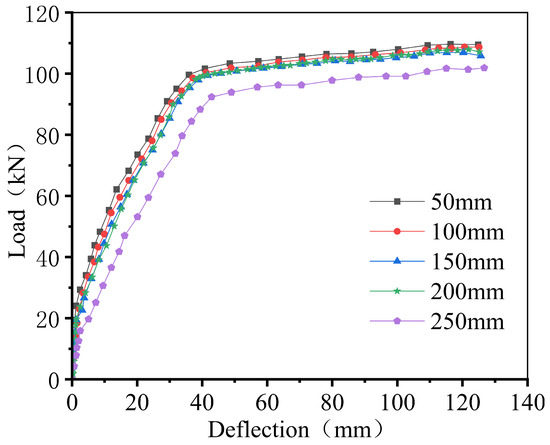 Figure 17 presents the load–deflection curves corresponding to different positions of stirrup relative to the joint. As shown, the closer the stirrups are to the joint, the higher the load-bearing capacity of the composite slab. When the distance between the stirrups and the joint is reduced from 250 mm to 200 mm, the flexural capacity of the composite slab increases by approximately 7.5%. Although further reduction in distance continues to enhance the load-bearing capacity, the rate of improvement gradually diminishes. Therefore, it is recommended that the stirrups should be placed within 200 mm on either side of the joint, which is also consistent with the requirements specified in Section 3.3 for the placement position of the first stirrups on both sides of the joint.