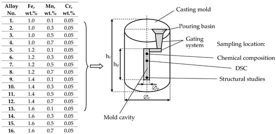 - performing melts of the AlSi7Mg alloy with varying shares of iron, manganese, and chromium according to the experimental plan (Figure 1),