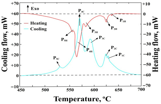 DSC tests were performed for each of the four iron contents at the minimum and maximum manganese content, i.e., for alloy numbers: 1, 4, 5, 8, 9, 12, 13, and 16. A typical heating and cooling curve obtained for AlSi7Mg alloy number 1 (1.01 wt.% Fe + 0.11 wt.% Mn) is shown in Figure 2, while that for alloy no. 12 (1.4 wt.% Fe + 0.69 wt.% Mn) is shown in Figure 3.