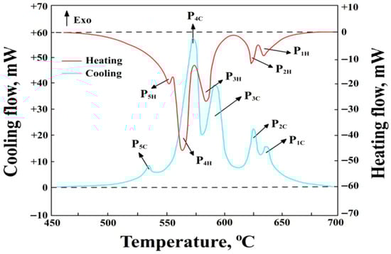 - P4H—thermal effect from the precipitation of the double eutectic α(Al)+β(Si) during heating, P4C—during cooling, mW,