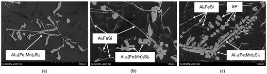 Representative microstructures (SEM) of the AlSi7Mg alloy after the introduction of iron, manganese, and chromium are shown in Figure 4.